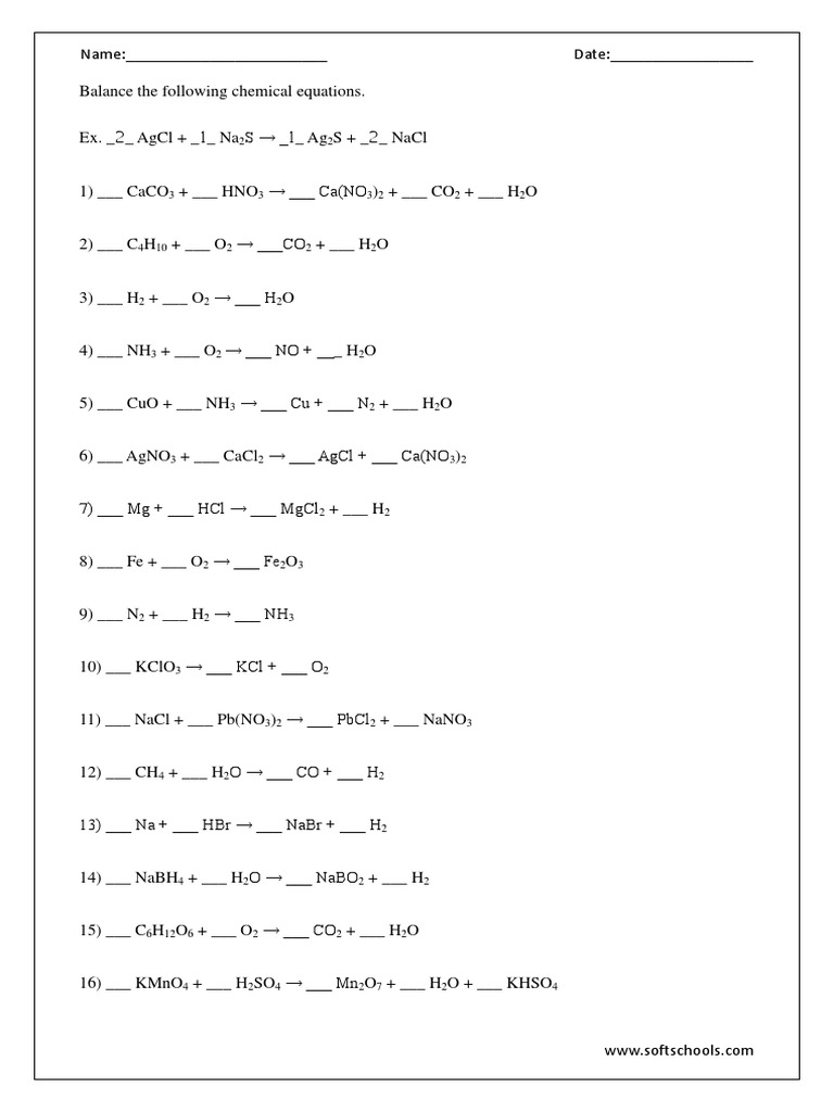 Chemistry Balancing Chemical Equations Worksheet Answer Key Pdf Balancing Chemical Equations Worksheets Pdf Eljq30o8zx41 For Each Of The Following Problems Write Complete Chemical Equations To Describe The Chemical from i1.wp.com Chemical equations, reactions, & stoichiometry. 1) 1 n 2 + 3 h 2 → 2 nh 3 2) 2 kcio 3 → 2 kcl + 3 o 2 3) 2 nacl + 1 f 2 → name: Access to all gizmo lesson materials, including answer keys. Always use the upper case for the first character in the element name and the lower case for the second character. They show the physical state of that substance. Making sure they are balanced must be done before the equation can be used in any chemically meaningful way. Balance each of the following equations. Balancing chemical equations answer key balance the equations below.